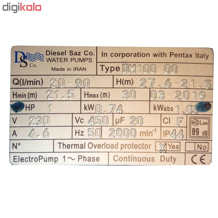 پمپ آب 1 اسب بشقابی مدل 00/DM100 محصولی از شرکت دیزل ساز. این پمپ مخصوص مکش آب تمیز با حداکثر دمای 90 درجهی سانتیگراد است. آب با دمای بیشتر از 40 درجه باعث آسیب دیدن پمپ و قطعات داخلی مانند اورینگ و سیل آن خواهد شد. قطر هر دو لولهی ورودی و خروجی پمپ 1 اینچ است. میزان آب خروجی از پمپ به 5 مترمکعب (هر متر مکعب برابر است با 1000 لیتر) برساعت میرسد. این پمپ قابلیت استفاده در سیستمهای آبرسانی - ساختمانی - صنعتی و کشاورزی را دارا می باشد. بدنهی این پمپ از جنس چدن، پروانهی آن از جنس نوریل و شفت آن از استیل ساخته شده. این پمپ با یک موتور تکفاز کار میکند و منبع تغذیهی مورد نیاز آن برق شهری است.