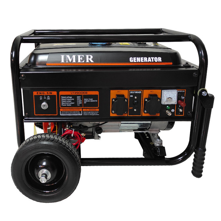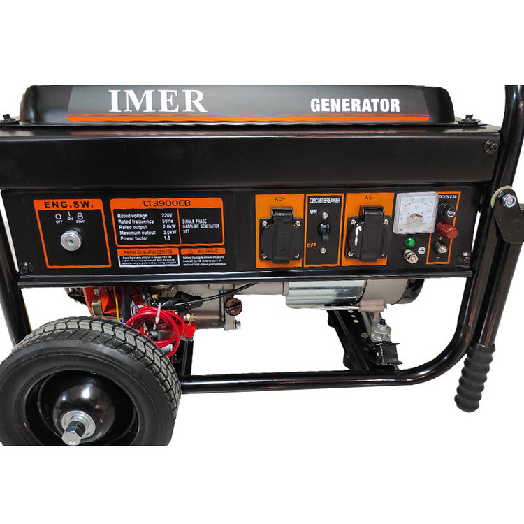 موتور برق استارتی سه کیلو وات ایمر مدل LT3900EB از سری موتور برق های بسیار با کیفیت و با قیمت بسیار مناسب می باشد. این موتور برق یک خروجی 12 ولت DC و هم چنین دو خروجی 220 ولت AC دارد. به کمک خروجی 12 ولت می توان باطری های 12 ولتی و هم چنین کفکش ها و پمپ های 12 ولت را به کار انداخت. لطفا قبل از استفاده دقت نمایید که موتور را با روغن توصیه شده پر کنید. اطلاعات فنی بیشتر را می توانید در کاتالوگ داخل کارتن محصول ملاحظه نمایید. برای حمل و نقل راحت تر این مدل استارتی در طراحی این مدل از چرخ استفاده شده است.