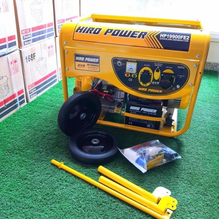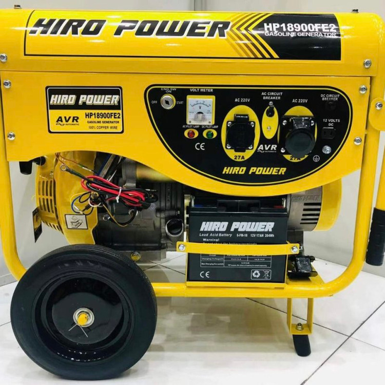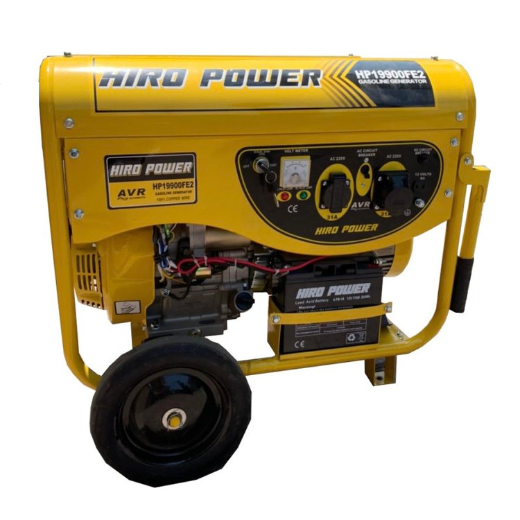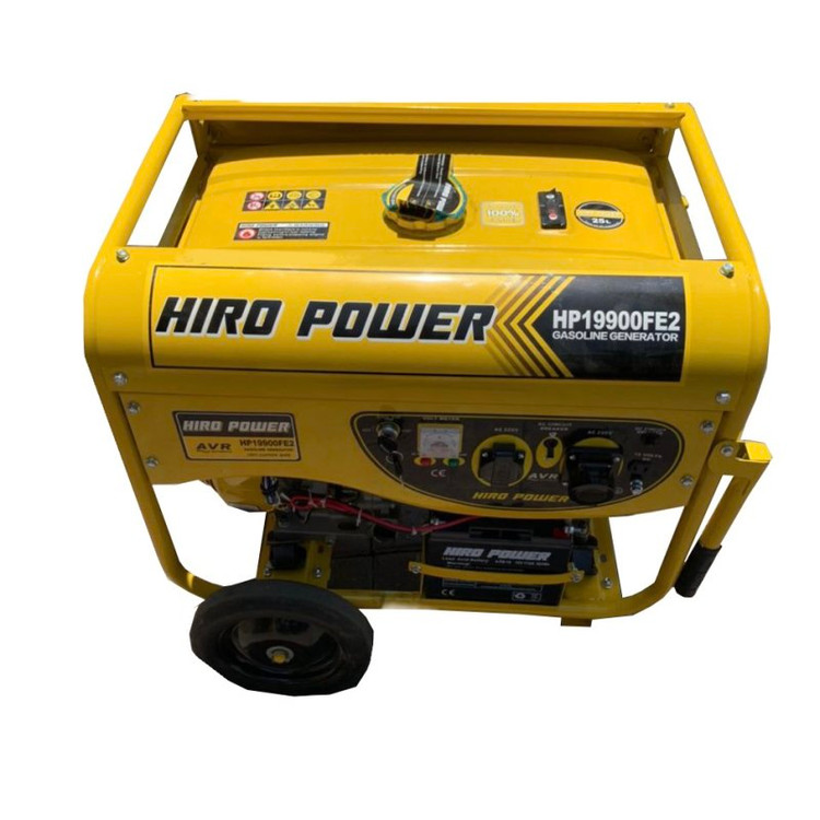 موتوربرق هیروپاور مدل HIRO POWER HP19900FE2 با استفاده از موتور 16 اسب بخار توانای تولید 8.5 کیلووات را دارد.موتوربرق هیروپاور از نوع موتور هواخنک, چهازمانه و تکفاز میباشد. نوع سوخت قابل استفاده بنزین , فرکانس 50 هرتز و آمپر خروجی 36 آمپر است وانسته ساختار و کیفیت بسیار بالایی را در بازار به خود اختصاص دهد. این محصول ابعاد 620 × 605 × 850 میلی متر و وزن حدود 96 کیلوگرم را دارد. خوب است بدانید که سوخت مصرفی این دستگاه بنزین است. محصول فوق روی شاسی بسیار مقاوم سوار شده و استارت ان به صورت الکتریکی و هندل دستی است. لازم به ذکر است که ظرفیت مخزن سوخت این موتور برق حدود 25 لیتر و حجم موتور آن 460 سی سی است. از ویژگی های بارز این محصول میتوان به ولتاژ خروجی 220 ولت، ولتاژ خروجی 12 ولت و شدت جریان خروجی حدود 8.3 آمپر برای خروجی DC و حدود 36 آمپر برای خروجی AC اشاره کرد. محصول فوق تکفاز بوده و دارای دو خروجی AC است. در قسمت ژنراتور ، استفاده از سیم پیچ 100% مس و به کار بردن تکنولوژی تثبیت ولتاژ و آمپر (AVR) جهت ثابت کردن خروجی برق که این قابلیت، این امکان را در این موتورها فراهم مینماید که بتوان در هر نوع دستگاهی اعم از مکانیکی و الکترونیکی فوق حساس نیز استفاده گردد، مانند (دستگاه های جوشکاری، جوش پلی اتیلن،کولر،یخچال،فریزر،تلویزیون،لپ تاپ و ....). موتوربرق بنزینی هیروپاور 8.5 کیلووات مدل HIRO POWER HP19900FE2 مجهز به سنسور روغن بوده و در صورت کاهش روغن موتور را خاموش میکند و تا زمانی که روغن موتور به مقدار لازم اضافه نگردد موتور روشن نمیشود.