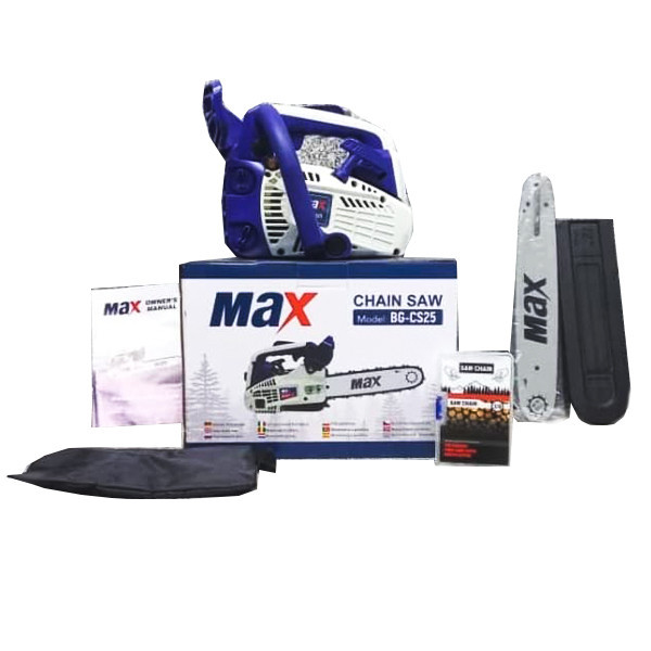 یکی از محصولات پر فروش این کمپانی اره موتوری مدل MAX BG-CS25 است که از موتور قدرتمند 1.5 اسب بخار و حجم موتور 25.4cc سانتی متر مکعب جهت برش و هرس انواع چوب بهره می برد . از ویژگی های این اره می توان به طراحی بسیار زیبا و ارگونومیک و کاربری آسان آن اشاره کرد. طول زنججیر این اره 30 سانتیمتر است که مجهز به زنجیر سفت کن می باشد. این مدل دارای ویژگی سیستم ضد ارتعاش جهت راحتی کاربر است. همچنین دارای سیستم روانکاری زنجیر به صورت اتومات برای افزایش عمر زنجیر و مجهز به ترمز زنجیر است. از مزیت های دیگر این دستگاه سیستم استارت و روشن شدن آسان دستگاه می باشد.
