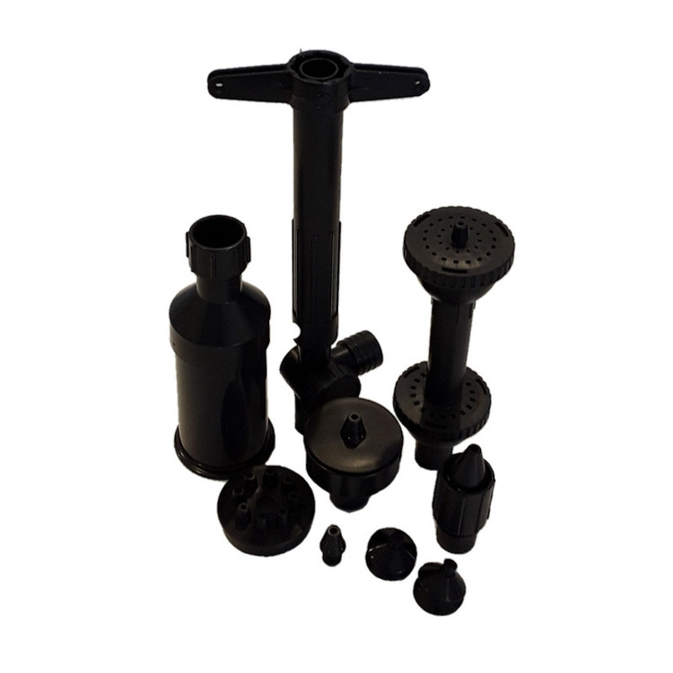 پک نازل فواره شامل پنج مدل سرنازل دو طبقه، نمکدان، قارچی پاشش چتری و افشان طبقاتی+لوله تلسکوپی با قابلیت تنظیم ارتفاع+اتصالات مربوطه جهت وصل شدن به پمپ بوده که میتوانید به پمپ های مختلف متصل کنید.توجه داشته باشید،پمپ ندارد و تصویر صرفا جهت نمایش نحوه ی نصب آن می باشد.